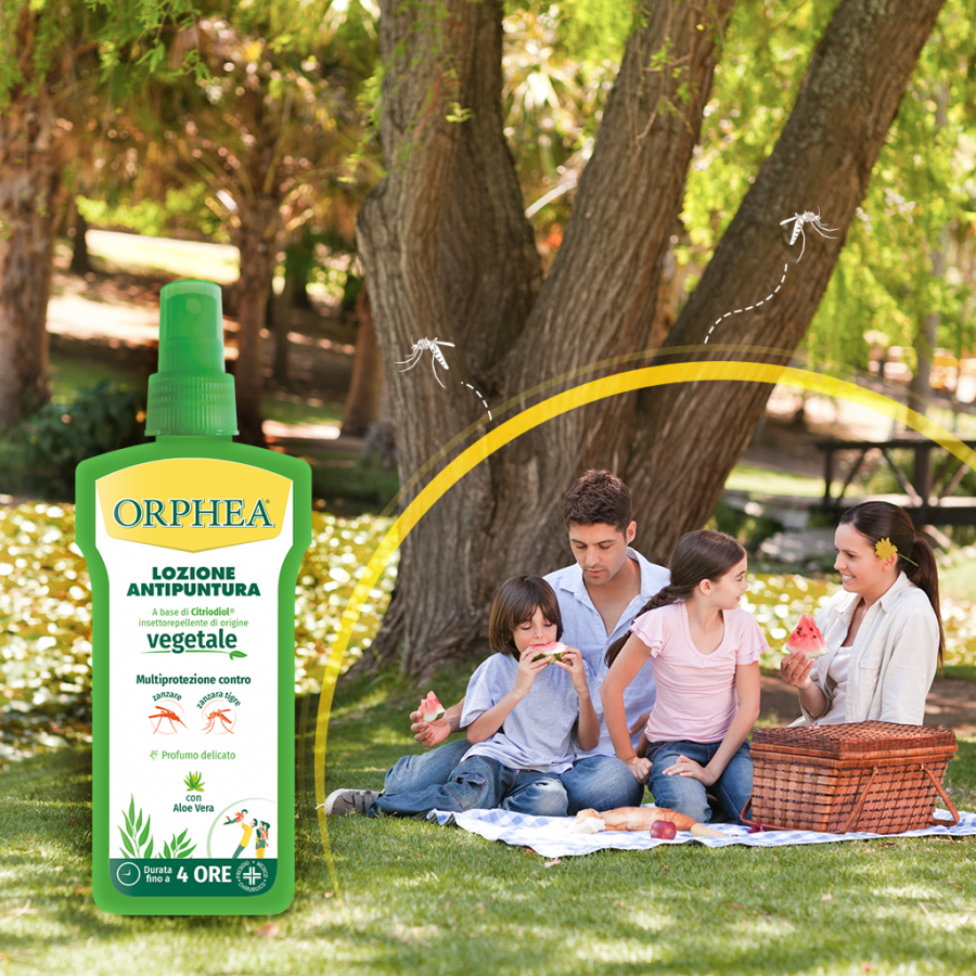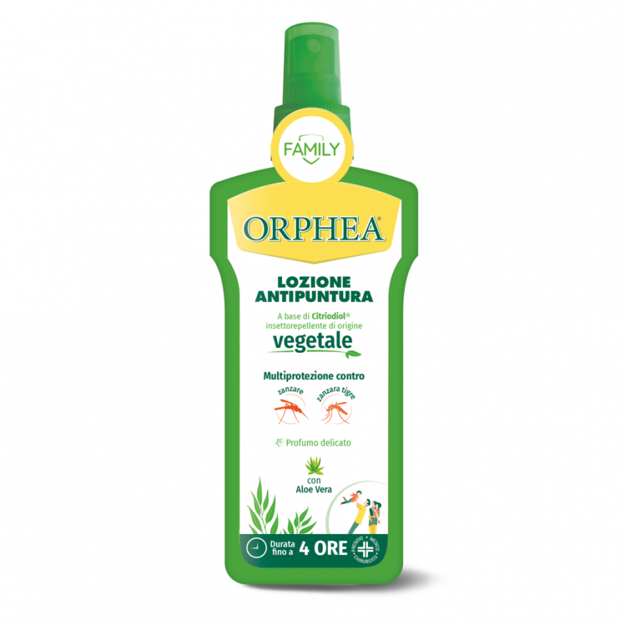 Orphea Protezione Persona Lozione Antipuntura protegge efficacemente la pelle dalle punture di zanzare e altri insetti. La sua efficacia è testata anche contro la zanzara tigre (Aedes albopictus). La sua formulazione è a base di Citriodiol, sostanza ad attività insettorepellente di origine vegetale ottenuta dall'Eucalyptus citriodora. L'Aloe vera dona alla pelle un piacevole effetto rinfrescante e idratante. Protegge efficacemente la pelle per oltre 4 ore. Non unge ed è gradevolmente profumata. Può essere utilizzata anche sui tessuti.