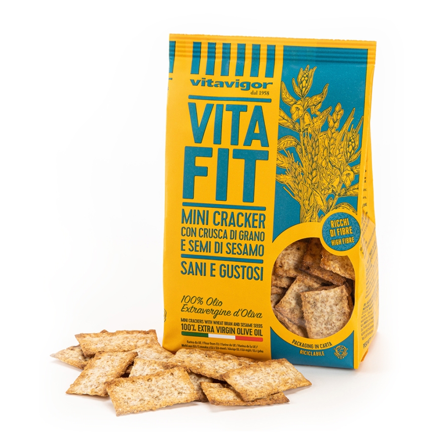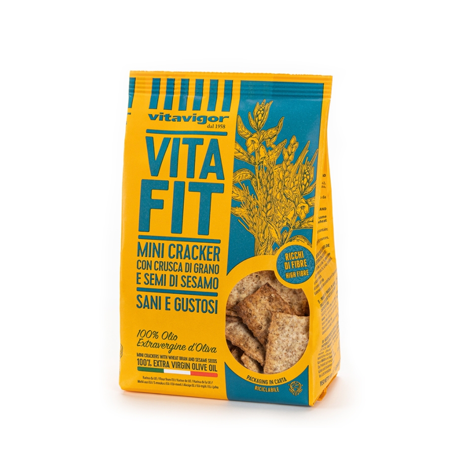 Mini Cracker con crusca di grano e semi di sesamo. Ricchi di fibre. Leggeri, fragranti e genuini, i Minicracker Vitafit con crusca di grano e semi di sesamo, sono la risposta perfetta alla tua voglia di uno snack sano e genuino. Dal gusto rustico e deciso grazie ai propri ingredienti sapientemente selezionati contribuiscono al fabbisogno nutrizionale quotidiano di fibre e rappresentano la risposta giusta alla tua voglia di un alimento moderno. Packaging riciclabile nella raccolta della carta.