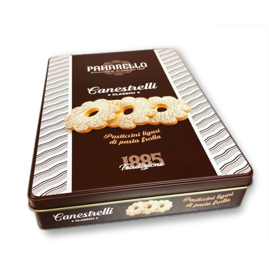 I Canestrelli Panarello sono fragranti specialit che mantengono intatto il gusto unico della tradizione. Il segreto di questo sapore inimitabile viene tramandato da pi di cento anni: una grande attenzione dedicata alla lavorazione artigianale e la scelta accurata di ingredienti semplici, sani e genuini. I Canestrelli Panarello sono dolci prelibatezze da gustare nei momenti speciali, per riscoprire la magia degli antichi sapori genovesi. Prodotto dolciario da forno. (270 gr)