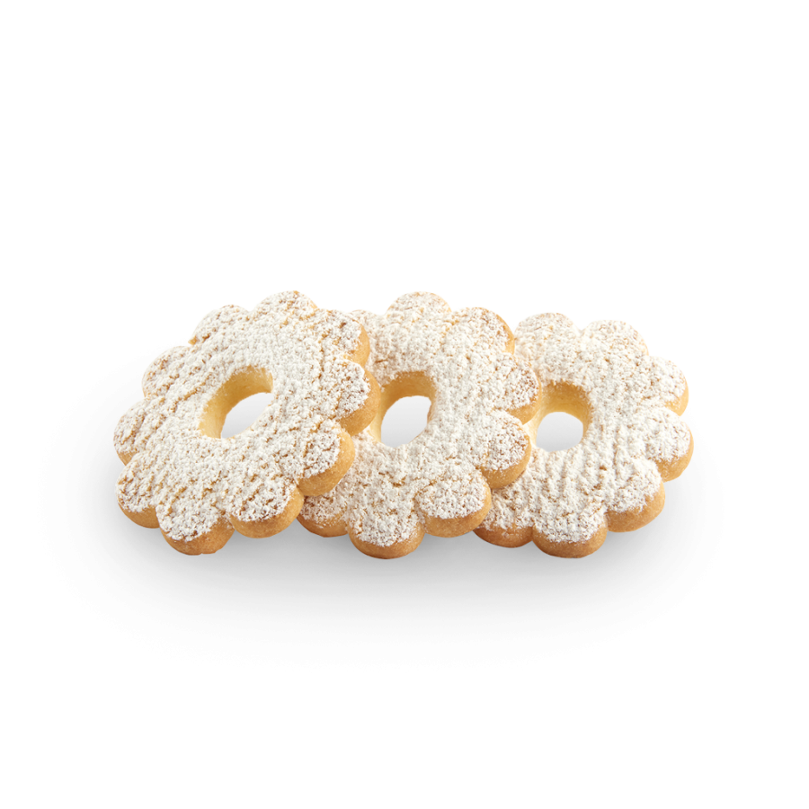 BISCOTTI FROLLINI Farina di frumento, burro, zucchero, latte parzialmente scremato, tuorlo d’uovo, albume d'uovo, aroma naturale. La bustina di zucchero a velo contiene: zucchero, amido di frumento, aromi. Può contenere: soia, arachidi, frutta a guscio.