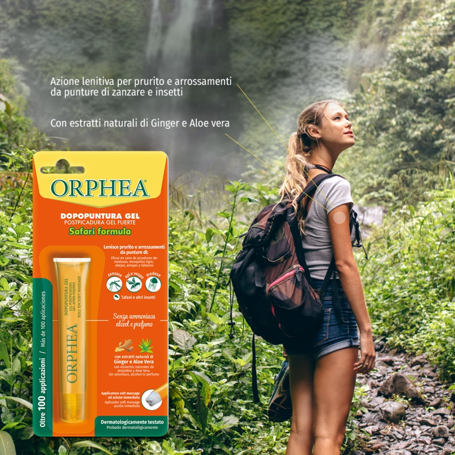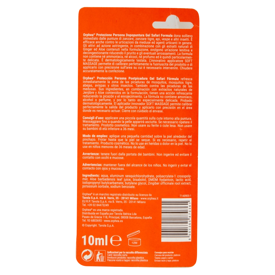 Oltre 100 applicazioni Orphea Protezione Persona Dopopuntura Gel Safari Formula dona sollievo immediato dalle punture di zanzare, zanzare tigre, api, vespe e altri insetti. È efficace anche contro le urticazioni da meduse ed agenti urticanti in genere. Gli attivi ad azione astringente, in combinazione con gli estratti naturali di Ginger ed Aloe contenuti nella formulazione, svolgono un'azione lenitiva e decongestionante riducendo il prurito e gli eventuali arrossamenti. La formula non contiene né ammoniaca, né alcool, né profumo ed è quindi particolarmente delicata. È dermatologicamente testata. L'innovativo applicatore Soft Massage permette di calibrare perfettamente la fuoriuscita del prodotto e di applicarlo con precisione sull'area su cui è necessario intervenire. Chiudere accuratamente la confezione.