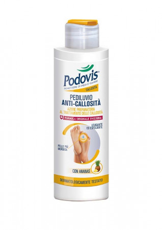 Svolge un’efficace azione preparatoria al trattamento di duroni e callosità. Ammorbidisce gli ispessimenti della pelle dei piedi. La presenza di microsfere regala un dolce effetto massaggiante ed esfoliante. La formulazione è arricchita con un estratto di Ananas ad azione cheratolitica. Formato: 200ml Modalità d'uso: Agitare prima dell’uso. Utilizzare una piccola quantità direttamente sulla pelle ispessita e sulle callosità, massaggiare e lasciare agire qualche minuto. Versare una quantità di prodotto desiderata in acqua tiepida e lasciare i piedi in ammollo per 10-15 minuti. Sciacquare. Per un’efficace azione correttiva del trattamento delle callosità utilizzare in abbinamento alla Crema Riduci e Previeni Callosità Podovis.