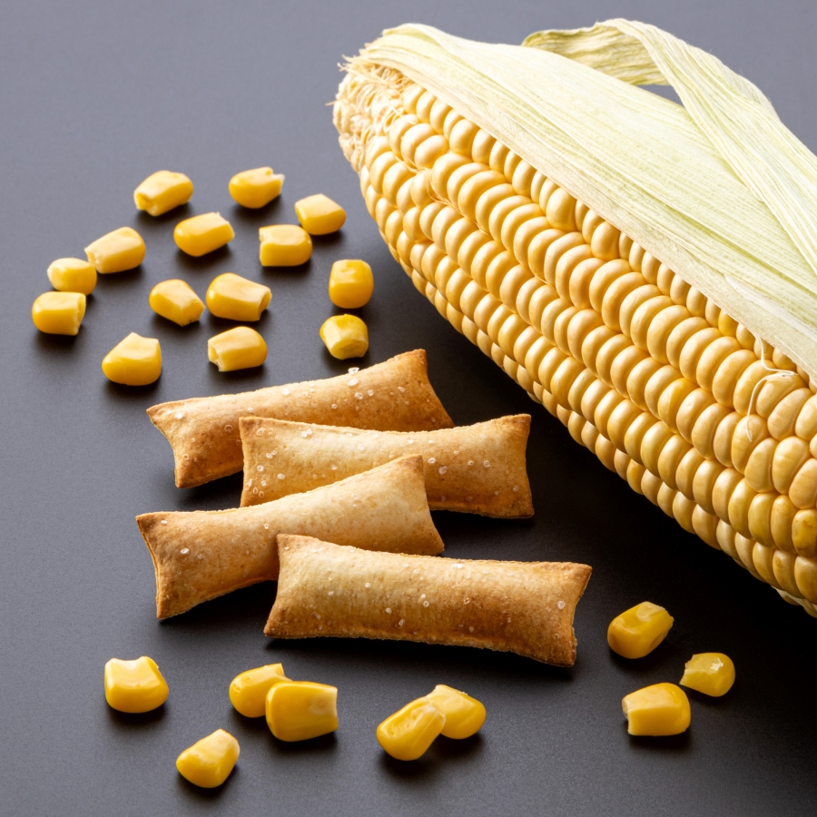 Prodotto da forno tipo “0” con farina di mais e olio extra vergine d’oliva (7%). Salati in superficie.